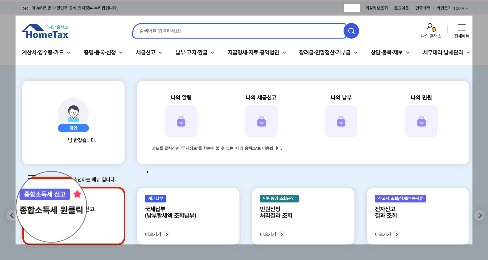 - 메인화면에서 '종합소득세 원클릭 환급신고' 메뉴 클릭